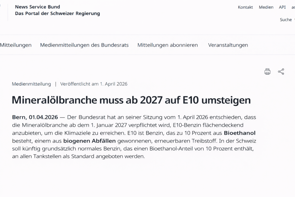 Gerade bei den aktuell hohen Benzinpreisen kann ein schrittweiser Übergang zu E10 einen pragmatischen Beitrag zur CO₂-Reduktion leisten, ohne zusätzliche Infrastruktur und mit der bestehenden Fahrzeugflotte. E10 ist zudem Bestandteil der geltenden Benzinnorm SN EN 228 und eine Einführung ist technisch möglich.